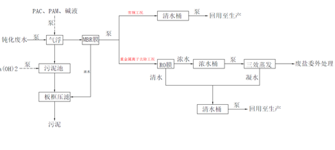 3、废水经过RO膜处理后,重金属铬、重金属镍等污染物被浓缩至浓水中。浓水通过三效蒸发器进行蒸发,蒸发后的冷凝水进入清水桶回用,蒸发后的废盐委外处理。RO膜产出的清水进入清水桶回用。